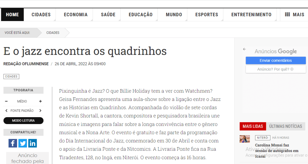 The event is part of the International Jazz Day program, celebrated on April 30th and had the support of Livraria Ponte and Nitcomics.