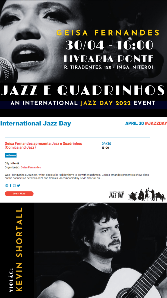Pixinguinha is Jazz? What does Billie Holiday have to do with Watchmen? Geisa Fernandes presents a show-class on the connection between Jazz and Comics. Accompanied by Kevin Shortall on the seven-string guitar, the Brazilian singer, songwriter and researcher brings together music and images to talk about the long coexistence between the musical genre and the Ninth Art.